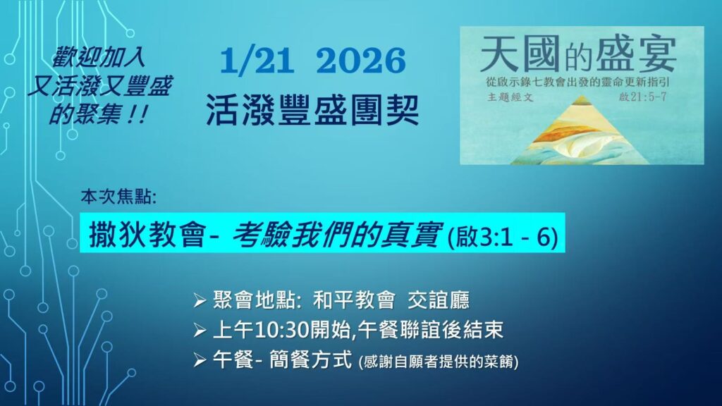吳牧師將繼續天國的盛宴系列 – 帶領我們進入士每拿教會-考驗我們的受苦(啟2:8-11)。我們並將一起動手完成10個聖誕禮物鞋盒的裝填。